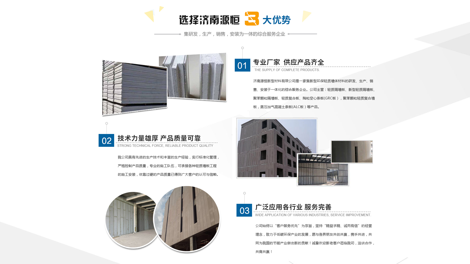 濟南源恒新型材料有限公司坐落于美麗的泉城濟南,是集新型環保輕質墻體材料的研發、生產、銷售、安裝于一體化的綜合服務企業。我公司具有的生產技術和豐富的生產經驗,為您提供輕質隔墻板、新型輕質隔墻板、聚苯顆粒隔墻板、輕質復合板、陶粒空心條板(GRC板),聚苯顆粒輕質復合墻板,蒸壓加氣混凝土條板(ALC板)等產品,本公司有專的施工隊伍,可承接各種輕質墻板工程的施工安裝。輕質隔墻板是國家推廣使用的新型輕質、綠色無害建材,是墻改節能政策大力扶持的環保節能產品,是發達國家普遍采用的新型墻體材料。濟南源恒新型材料有限公司實行標準化管理,嚴格控制產品質量,依靠過硬的產品質量已得到廣大客戶的認可與信賴。公司產品遍布各大城市,與國內多家客戶建立了良好的合作關系。公司始終以“客戶服務優先”為宗旨,堅持“精益求精、誠而有信”的經營理念,致力于低碳環保產業的發展,愿與各界朋友共創共贏,攜手共進,共同為我國的節能產業做出新的...